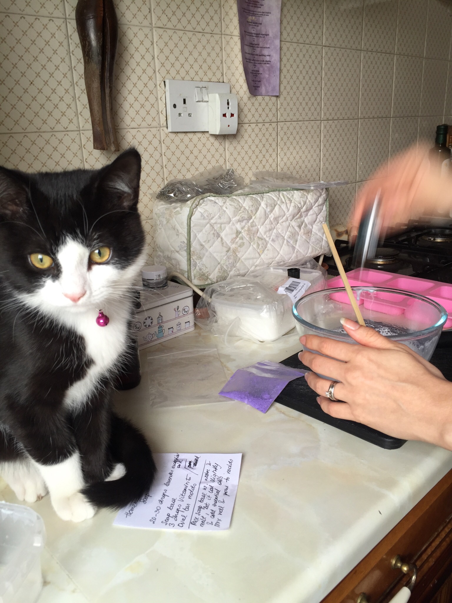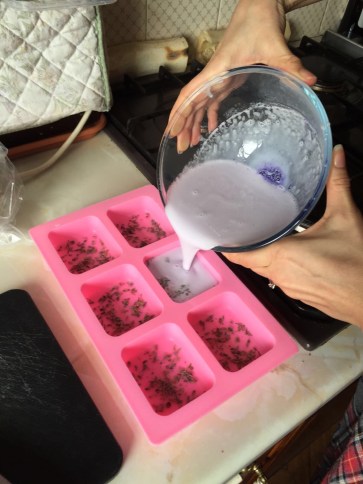 Last week I set up a “soap factory” in our kitchen ;). Under the watchful eye of our kitten I mixed some goat’s milk soap base with purple colouring and essential oils. A recipe I had found on Dr. Axe. Very easy to make and the soaps are free of harmful chemicals!
